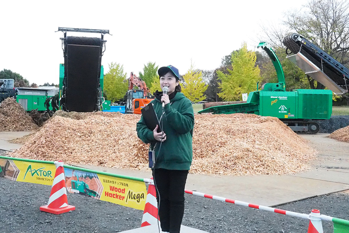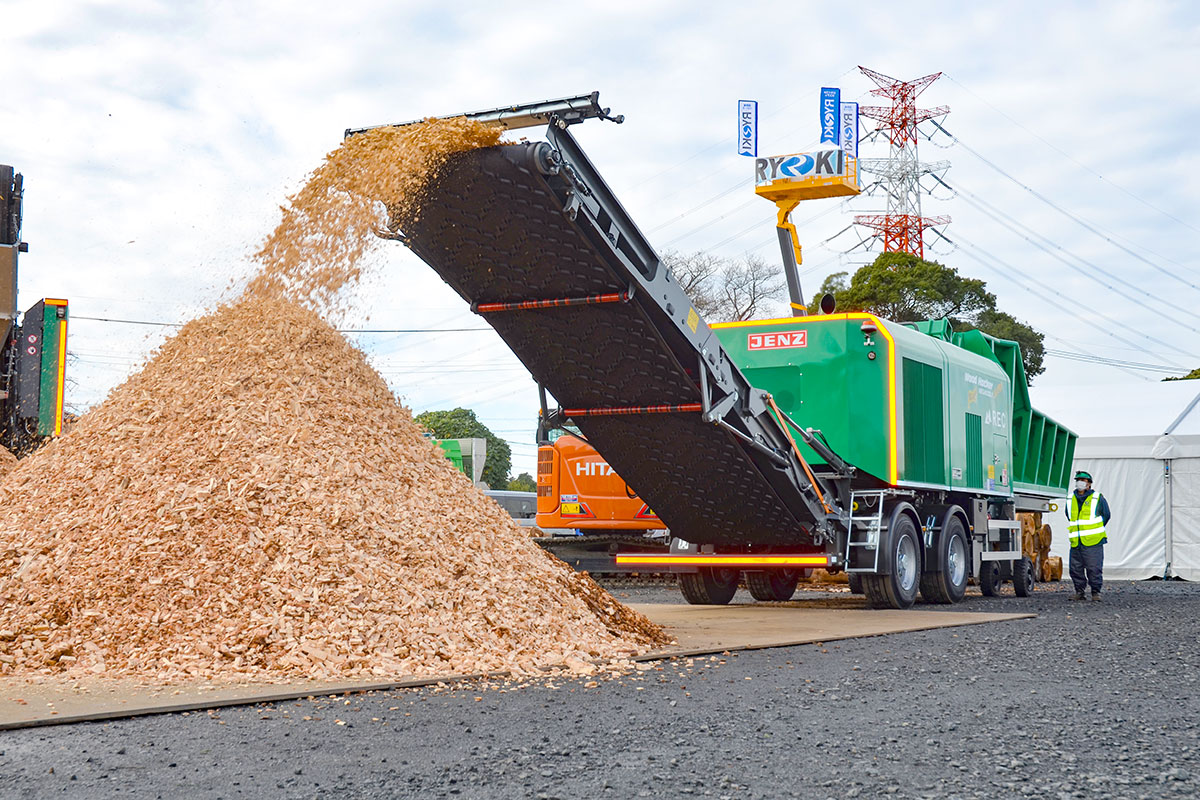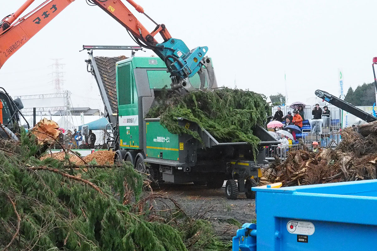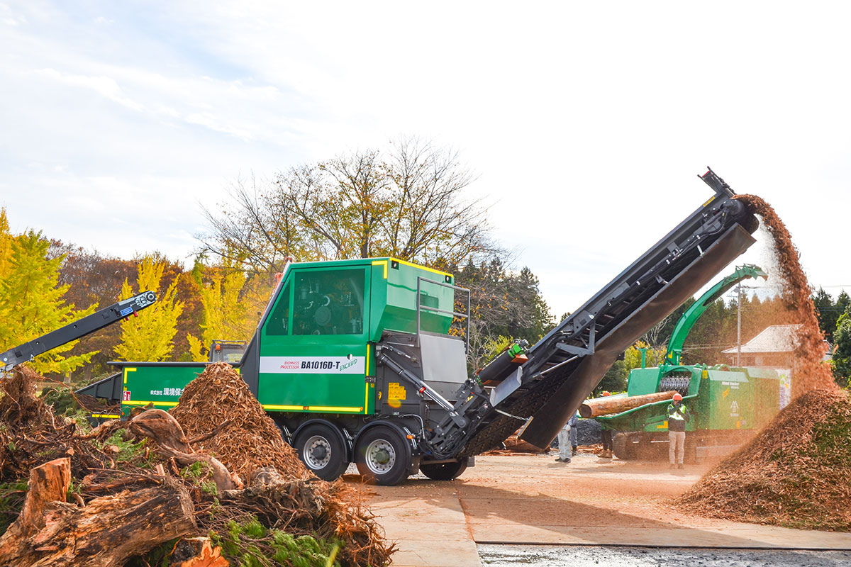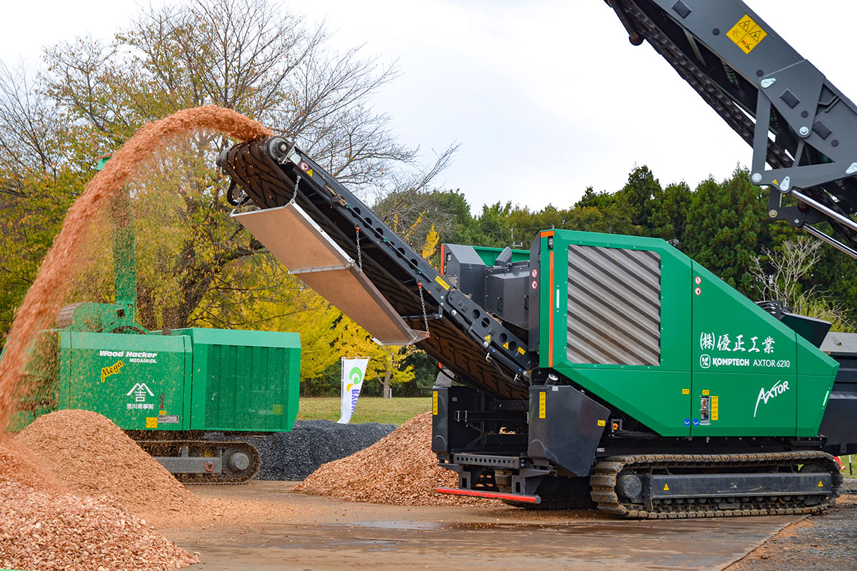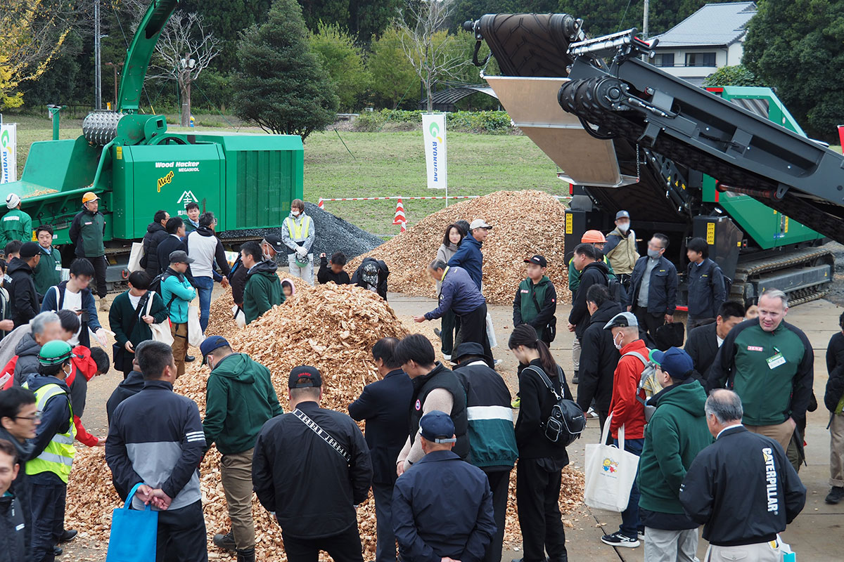 幹材だけでなく根株から枝の先まですべての未利用木質資源の有効活用に役立つ一連の機械を出展し、