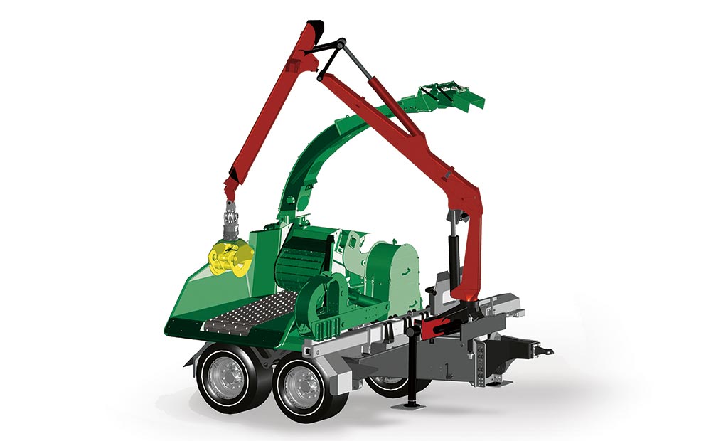 中間土場での作業に適した中型クローラー自走式およびトラクター牽引式、大規模生産用には大型牽引式、発電所や製材工場でのプラント化に電動定置式等 各種モデルを用意しています。