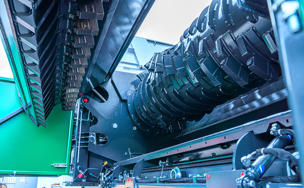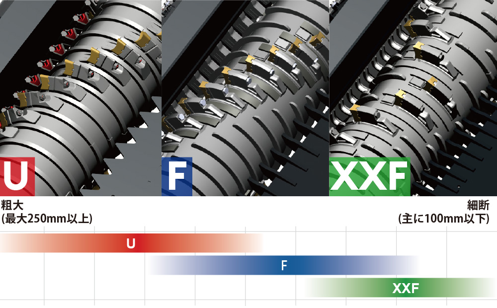 低速回転するドラムとカウンターナイフは、目的や用途に合わせて3種類から選択可能で、多様な材料に対し安定した破砕処理を実現します。
